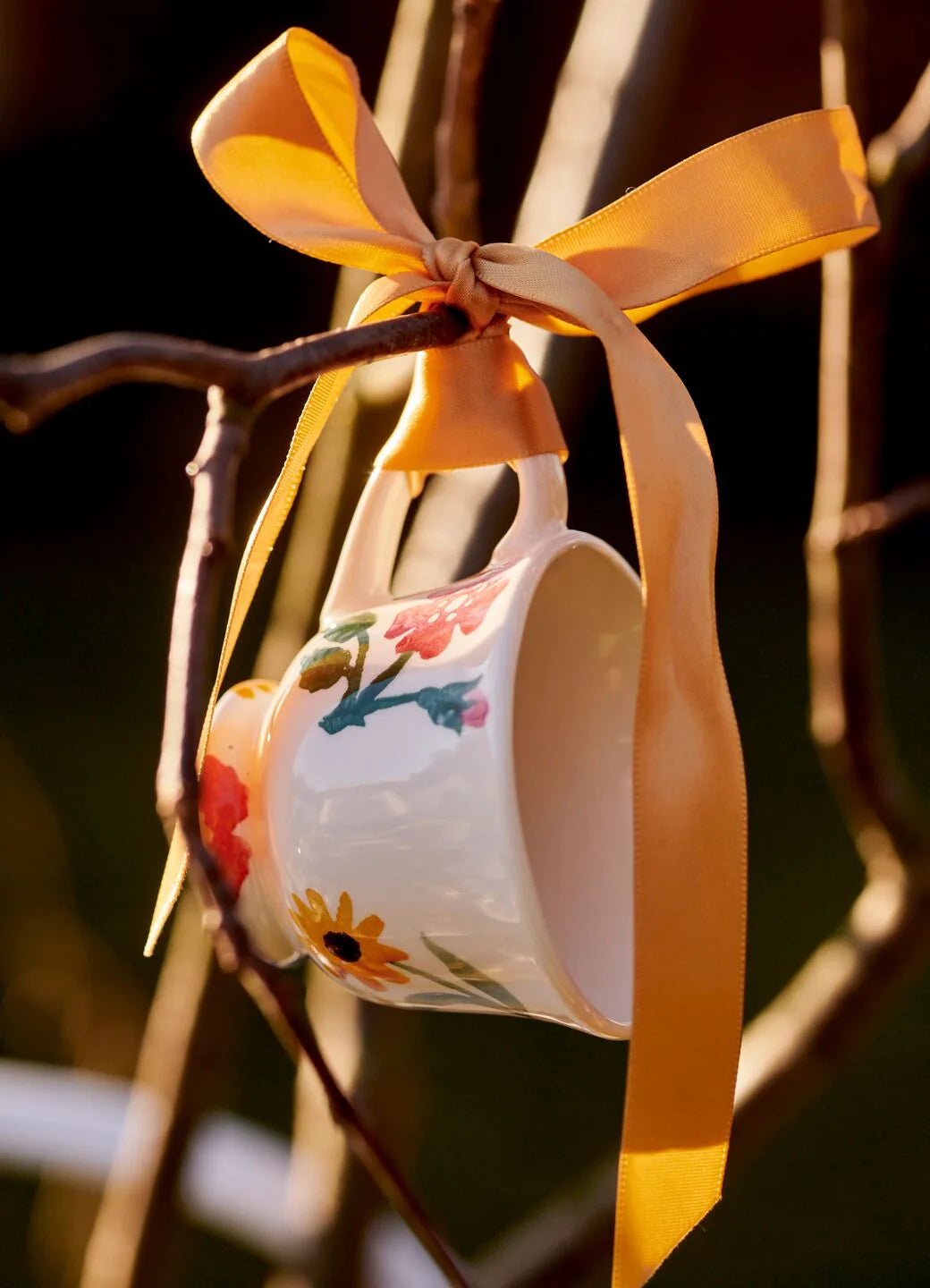The beauty of an Emma Bridgewater miniature ornament, such as a Poppies & Pinks Tiny Teacup, complete with ribbon, is its versatility. Create a display of lichen-covered branches for Easter from which to dangle this tiny teacup together with the matching mug and jug, or hang this tiny pottery decoration by its ribbon from the dresser. Our hand-decorated small floral tea cup can even double up as an egg cup!