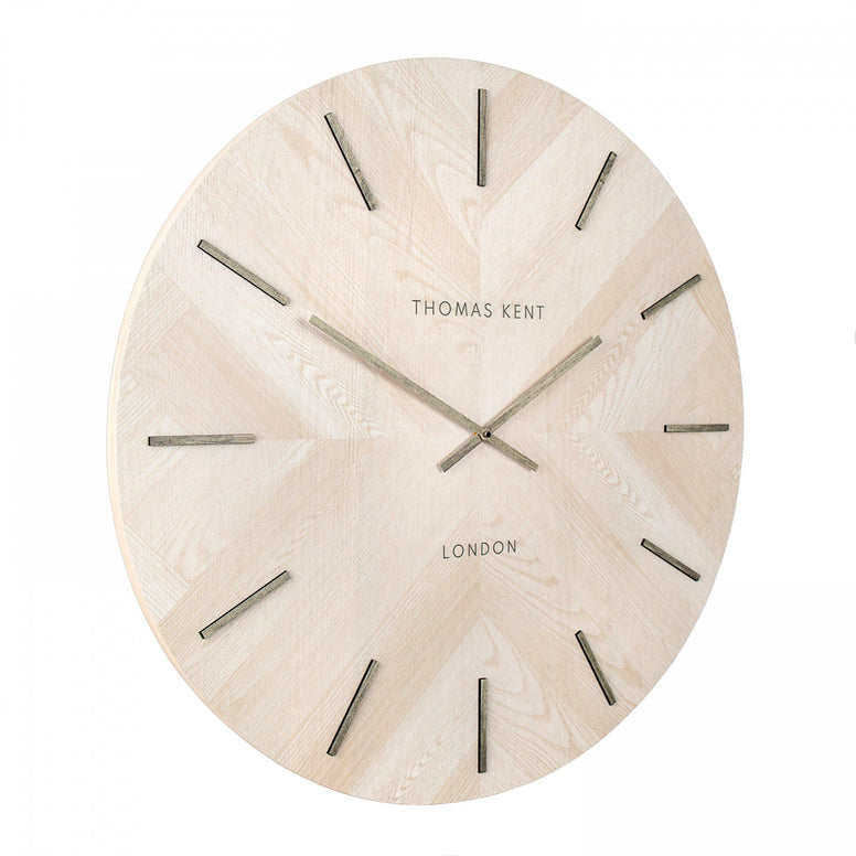 The Wharf Herringbone a modern concept development of the grand wharf clock, using a sleek herringbone laydown. Seizing the warm tones found in young oak, a butterfly impression wraps around the 30-inch dial. Raised numerals in a contrasting wood stand proud around the face. Matching hands complete the design.