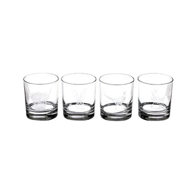 Each glass features a different country animal - a Stag, Highland Cow, Hare and Pheasant.