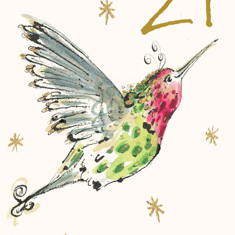 A gold foil embossed 21st birthday card illustrated with a happy dancing Hummingbird and the handwritten number ’21’.