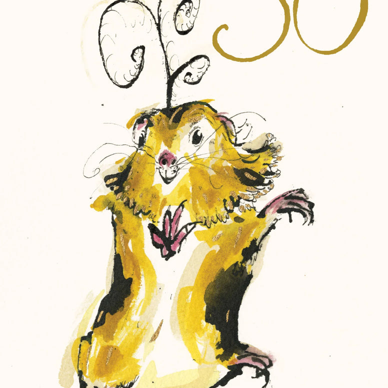 A gold foil embossed 30th birthday card illustrated with a happy dancing Guinea Pig and the handwritten number ’30’.