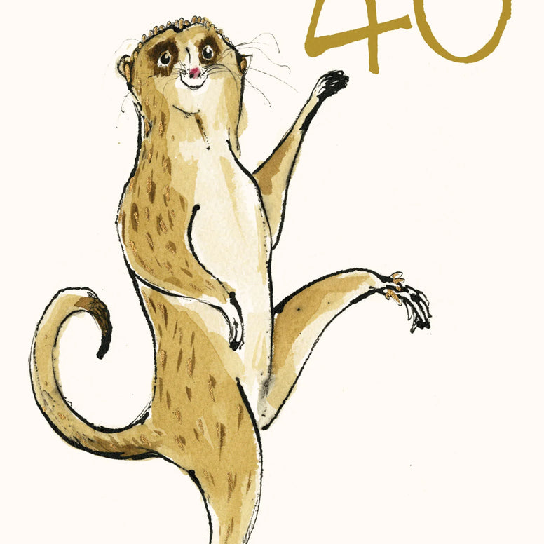 A gold foil embossed 40th birthday card illustrated with a happy dancing Meerkat and the handwritten number ’40’.