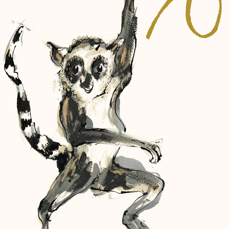 A gold foil embossed 70th birthday card illustrated with a happy dancing Lemur and the handwritten number ’70’.