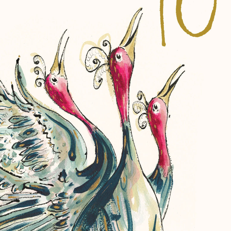 A gold foil embossed 90th birthday card illustrated with happy dancing Cranes and the handwritten number ’90’.