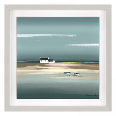 Two boats beached at low tide mimic the two high and dry cottages ashore in Ulyana Hammond's serene seascape with a cool, calm palette of greys, greens, earthy browns and salmon pinks.