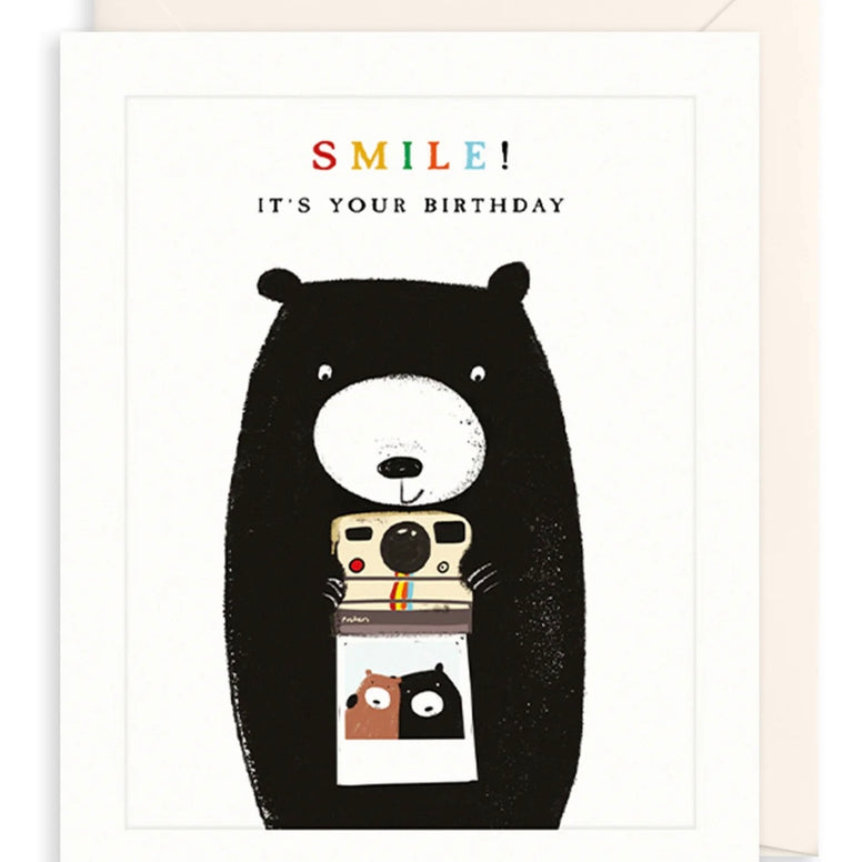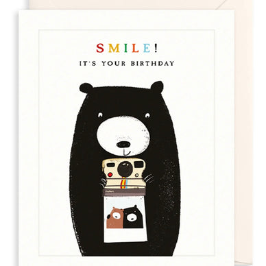 Say happy birthday with this fun and thoughtful card. This card features a bear holding a camera that's printing a polaroid photo. The card says 'Smile! It's your birthday.'