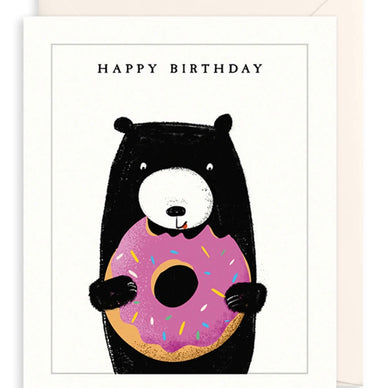 Celebrate an important birthday with this adorable birthday card. This card features a bear eating a large doughnut.