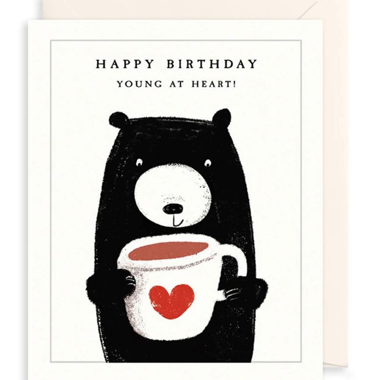 Celebrate a birthday with this lovely birthday card. This card features a bear holding a cup of tea with a heart on it. The card reads 'Happy birthday, young at heart!'