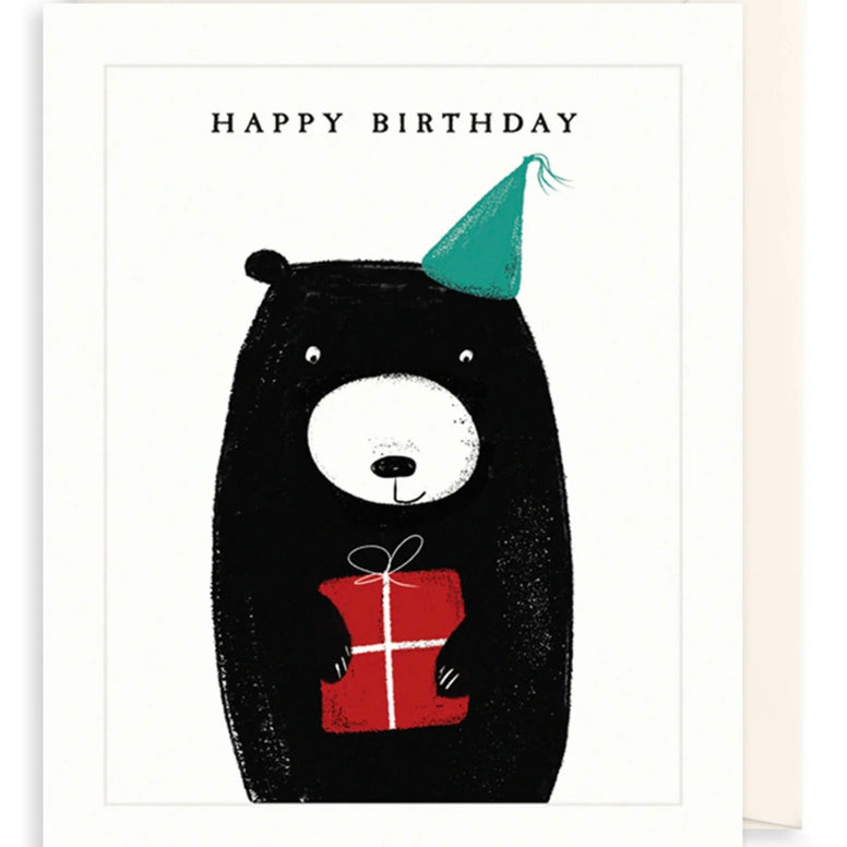 Say happy birthday to someone special with this cute card. This card features a party bear holding a red present. The card reads 'Happy Birthday.'