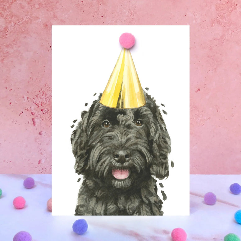 With an adorable little nose you could reach out and kiss, here's Bailey the Cockapoo. Brighten someone's day with this beautiful high-quality card produced from my original painting, featuring a 12mm pompom which adorns his party hat! This greeting card is perfect for any dog lover's birthday, or any occasion that warrants a celebration! The cards come individually wrapped in cellophane and are printed on premium quality, FSC-certified 350gsm thick card, featuring a high quality print of an original watercolour painting by the artist Robert James Hull, hand embellished with a beautiful and modern coloured pom pom.