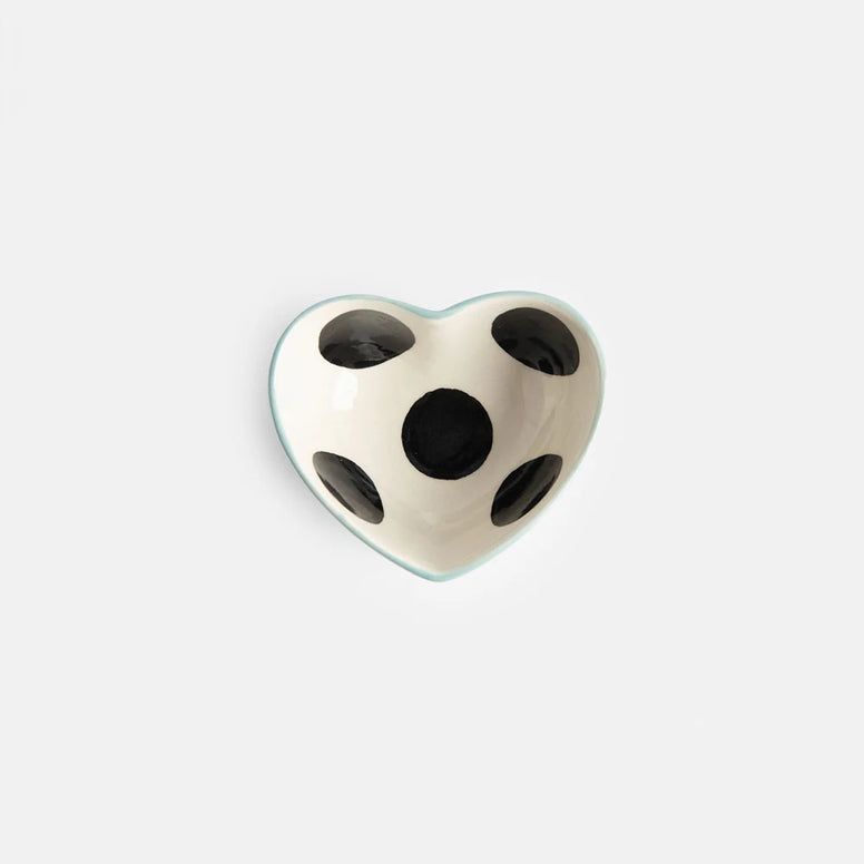 Fall in love with our heart shape spot trinket bowl. Crafted with care in glazed stoneware, this hand-painted beauty boasts a playful black spot design on the inside and soft light blue outside. Perfect for storing small trinkets or serving some nibbles in.