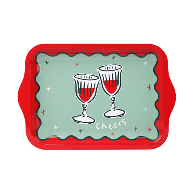 Raise a smile (and a glass) with this joyful small tray from the Bon Noël collection. Featuring two illustrated wine glasses toasting above the word “Cheers”, it’s set against a mint green background and framed with a festive scalloped red border. Ideal for serving drinks, mince pies, or leaving a treat out for Santa.