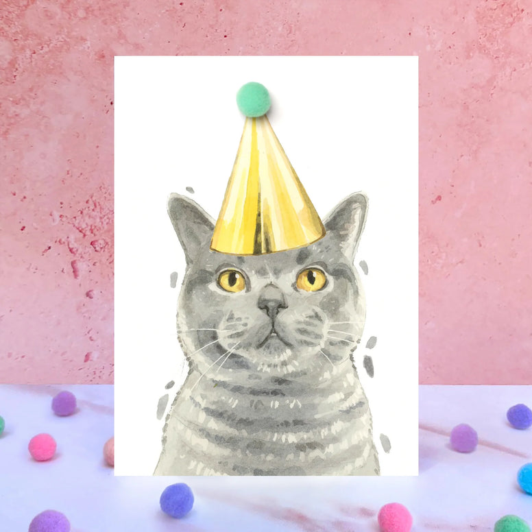 With an adorable little nose you could reach out and kiss, here's Louis the Blue British Shorthair cat. Brighten someone's day with this beautiful high-quality card produced from my original painting of Louis, featuring a 12mm pompom which adorns his party hat! This greeting card is perfect for any cat lover's birthday, or any occasion that warrants a celebration! The cards come individually wrapped in cellophane and are printed on premium quality, FSC-certified 350gsm thick card, featuring a high quality print of an original watercolor painting by the artist Robert James Hull, hand embellished with a beautiful and modern coloured pom pom. Individual envelopes included. Card face measures 176mm x 126mm. The card is left blank inside for your own personal message.