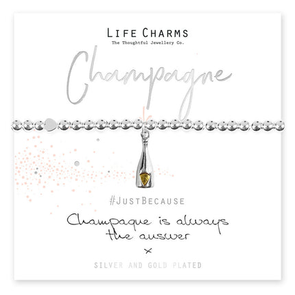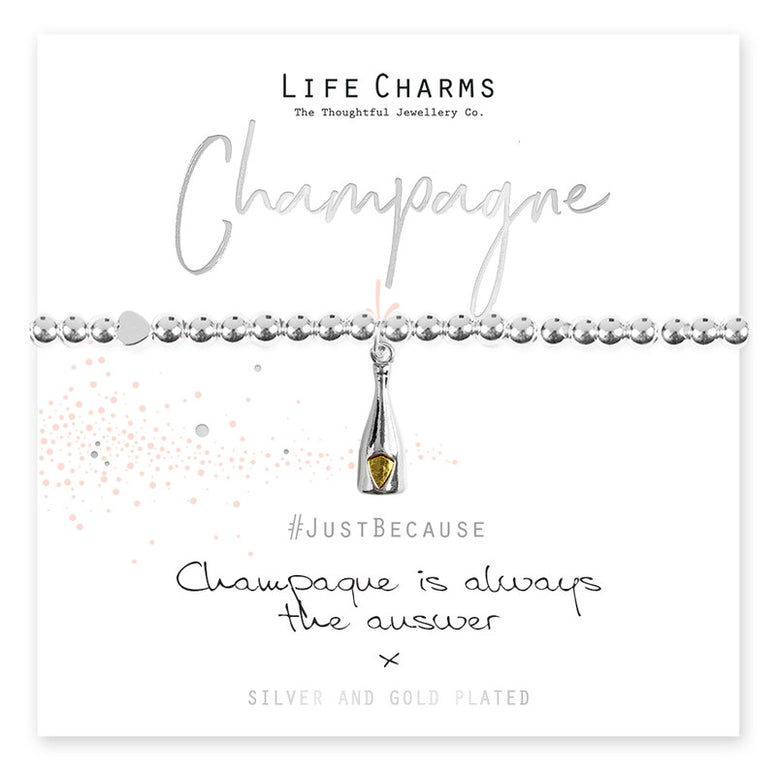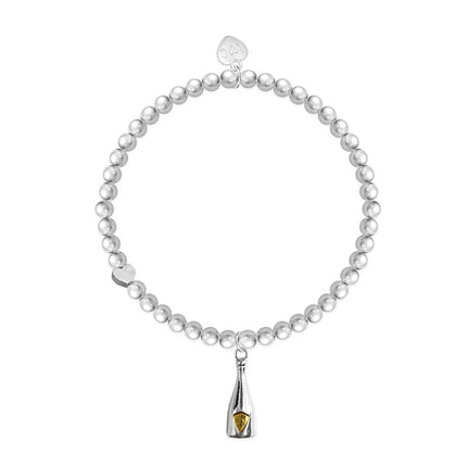 Beautiful pure silver plated Champagne bottle charm on 5mm beaded stretch bracelet. The bracelet comes presented in a luxury gift box, with a Just Because 'Champagne is Always The Answer' card.  The perfect gift to for an absolutely fabulous loved one.