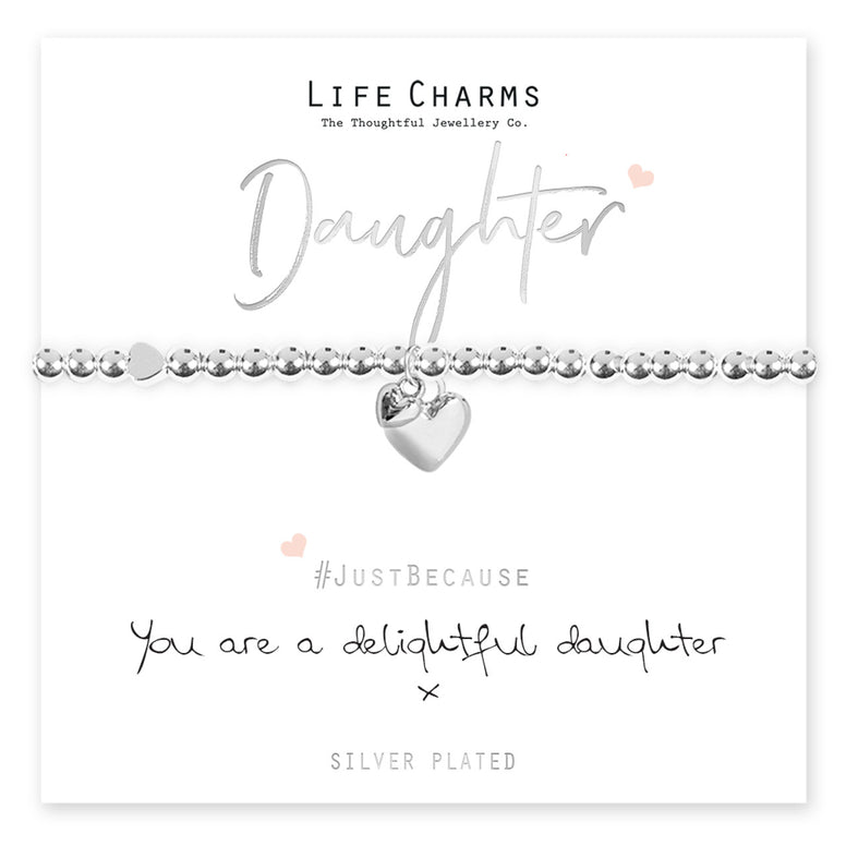 Pure silver plated modern heart charm, on 5mm beaded stretch bracelet. The bracelet comes presented in a luxury gift box, with a Just Because 'You Are A Delightful Daughter' reversible card.