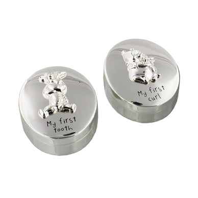 A stunning Disney Winnie the Pooh silver plated tooth and curl set designed to be kept as a beautiful keepsake. The 'My First Tooth' holder is adorned with the happy Tigger and the 'My First Curl' holder is adorned with an affectionate Pooh and Piglet embracing. The set is lined with a cushioned satin finish to create a real sense of timeless luxury. This stunning keepsake tooth and curl set comes in high quality, branded packaging.