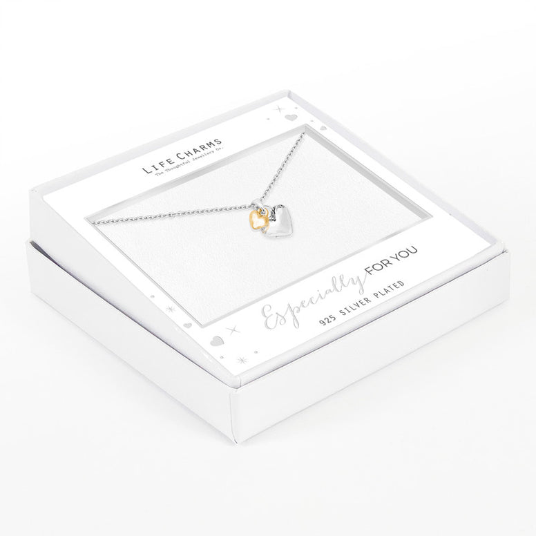 Adjustable chain necklace with two puffed heart charms crafted in silver and gold with attention to detail and aesthetic appeal. To add to the luxury experience, each piece of jewellery includes a complimentary gift box.