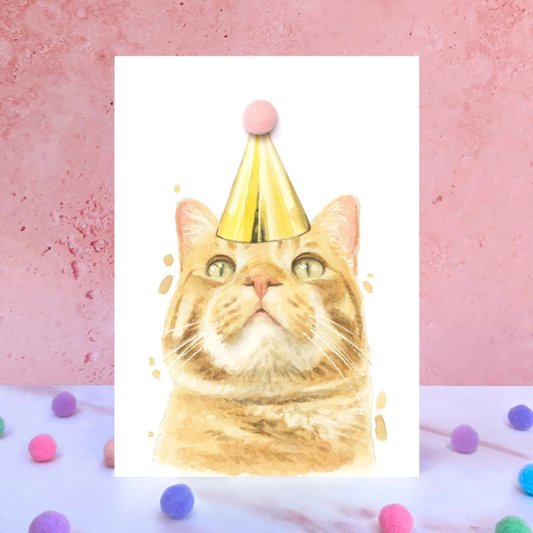 With an adorable little nose you could reach out and kiss, here's Eric the ginger tabby cat. Brighten someone's day with this beautiful high-quality card produced from my original painting of Eric, featuring a 12mm pompom which adorns his party hat! This greeting card is perfect for any marmalade or orange cat lover's birthday, or any occasion that warrants a celebration! The cards come individually wrapped in cellophane and are printed on premium quality, FSC-certified 350gsm thick card, featuring a high quality print of an original watercolour painting by the artist Robert James Hull, hand embellished with a beautiful and modern coloured pom pom. Individual envelopes included.
