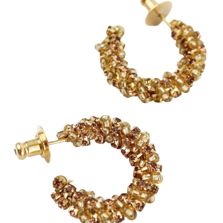 Shine bright with these beautiful hoop earrings featuring a cluster of gold beads and gems.