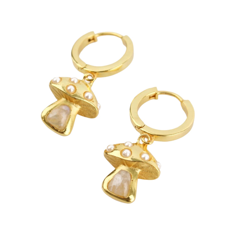 Gold hoop earrings featuring a moonstone and pearl mushroom charm.