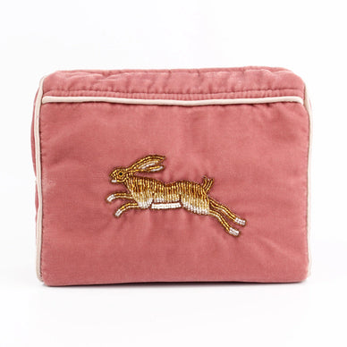 Perfect for animal lovers, our playful hare medium pouch is a must-have this season. Made from beautiful gold and bronze beads on a dusty pink velvet.