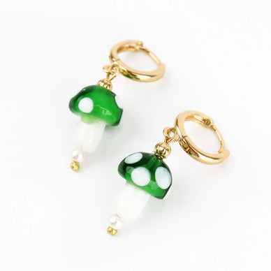 Super cute green glass mushroom charm on a huggie hoop - perfect for the autumn!