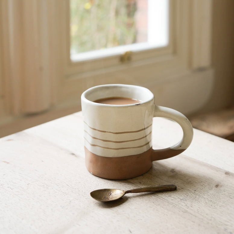 A hand painted mug with Breton stripes. The hand finished nature gives a beautiful organic feel to the piece, meaning no two pieces will be identical - which we think adds to their charm and makes them feel extra special.