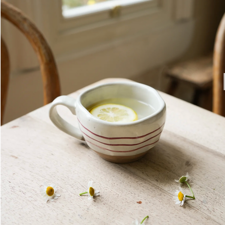 A hand painted tea cup with Breton stripes. The hand finished nature gives a beautiful organic feel to the piece, meaning no two pieces will be identical - which we think adds to their charm and makes them feel extra special.