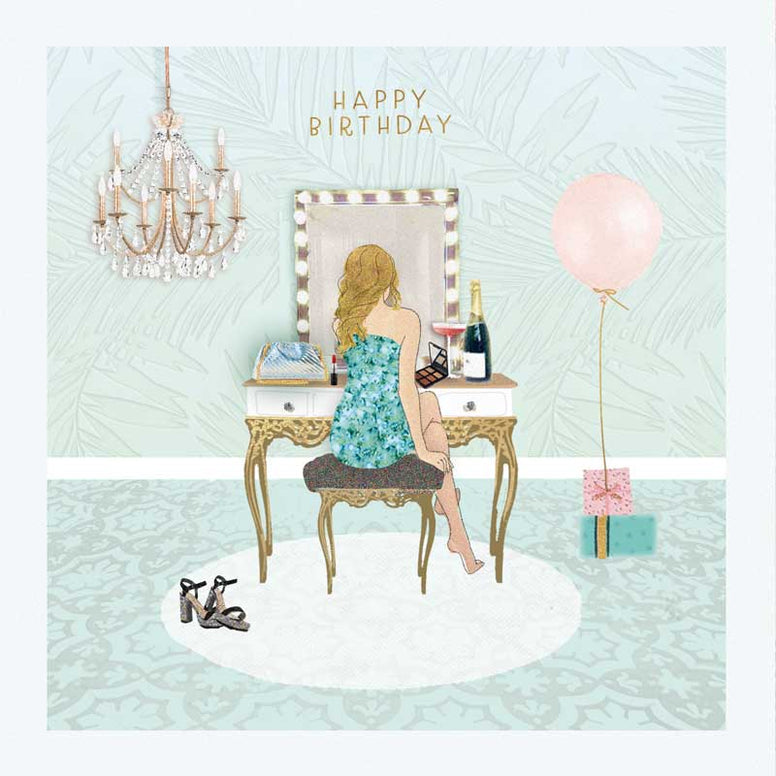 Elevate the celebration with this pretty Happy Birthday Card, a charming visual feast capturing the joyful moments of a birthday celebration. The stunning illustration features a young lady in a delightful teal dress, immersed in the enchantment of her special day. With a palette of soft hues, she enjoys a moment of beauty and excitement as she puts on her makeup, surrounded by birthday presents and a pretty pink balloon.