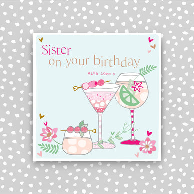 Happy Birthday Sister - Cocktails. Foiled and embossed. Supplied with an envelope.