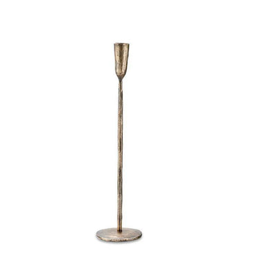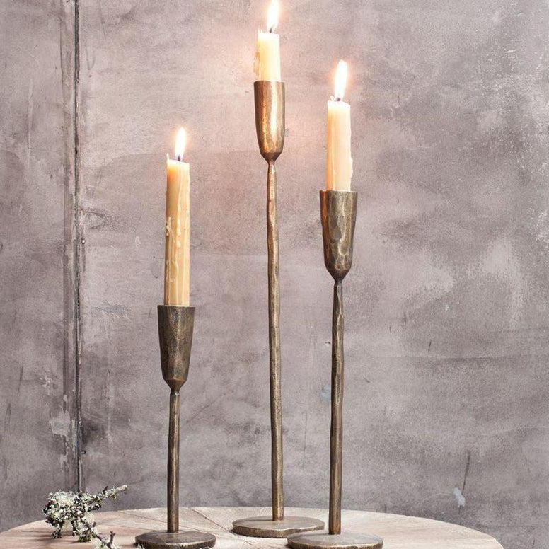 These iron Mbata candlesticks have an elegant stem and artisan looking candle holder that is well suited to a table or sideboard. The rustic finish is skilfully created during the soldering process. This affect adds to the aesthetic of the design and compliments the brass material. Mix and match heights for an attractive display.