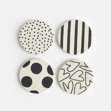 Add some bold monochrome style to your living space with our new set of 4 stoneware coasters. Each coaster has anti-slip feet and is hand painted with a different bold black design on an off white base.