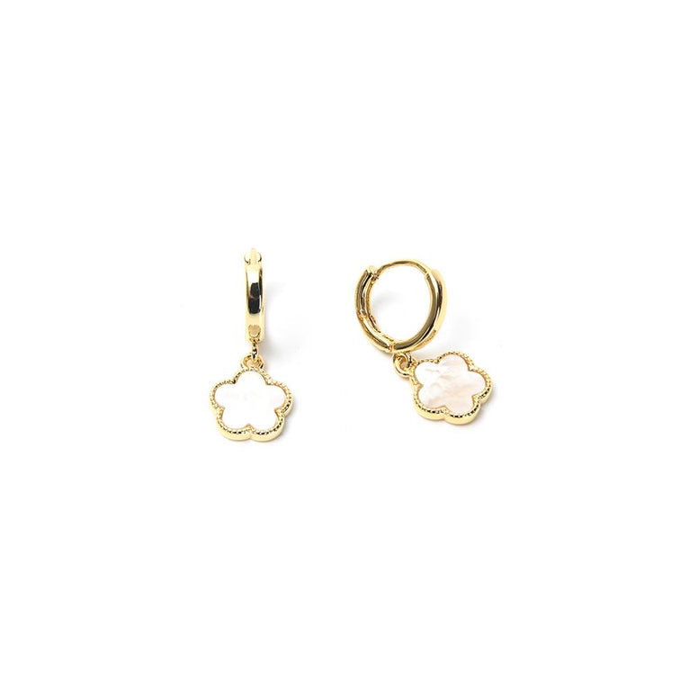An enchanting addition to your jewellery collection, these Huggies' earrings feature delicate Mother of Pearl flowers, delicately crafted from 14 karat gold plated brass. Measuring 25mm in height and 10mm in width, these earrings are perfect for adding a touch of whimsy to any ensemble.