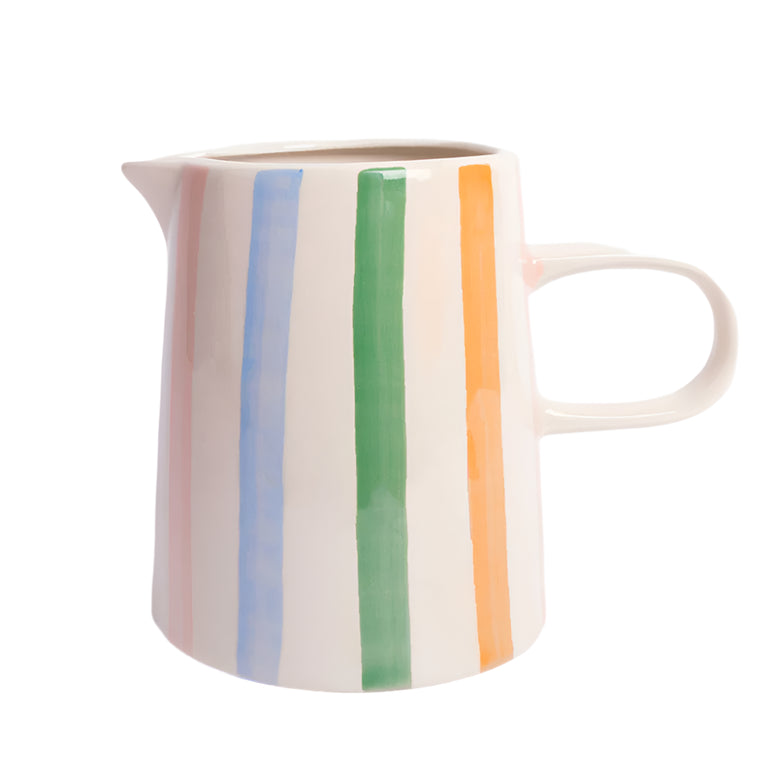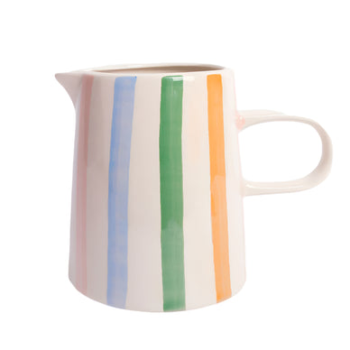 This beautiful hand painted glazed stoneware jug with an elongated handle has a colourful stripe design which will add an splash of style to any kitchen. Ideal for use as a water jug, a vase, or just a beautiful objet d'art.
