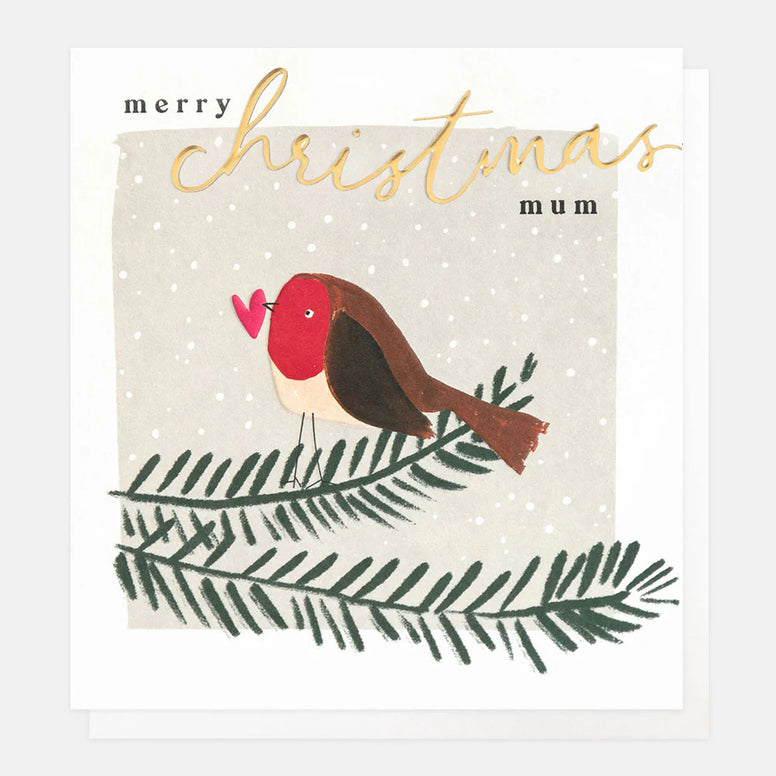 Wish your mum the merriest of Christmases with this cute robin perched on a branch holding a little red heart card. Featuring gold foil lettering and embossing and left blank inside for you to write you own personal message.