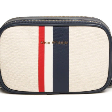 This stylish and functional bag is crafted with a unique combination of materials and features a bold striped band design. With two compartments, an internal pocket, and an adjustable strap, it's perfect for keeping your essentials organised and within reach. Available in this striking colorway: Navy/Cream with red and white stripes. A matching Tote is available for a complete set.