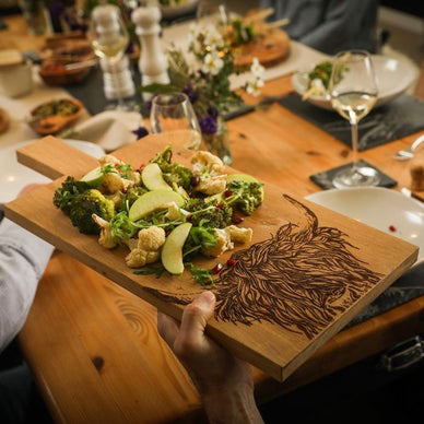 Featuring a fun engraved highland cow design, this large serving paddle is a great way to add country charm to your kitchen and dining table. This hand crafted Scottish Oak serving paddle is generously sized, so you can prepare and present generous amounts of whatever you fancy - breads, cold meats, cheeses, nibbles, snacks or antipasti of any kind. With its unique design you can create an impressive table presentation when entertaining at home.