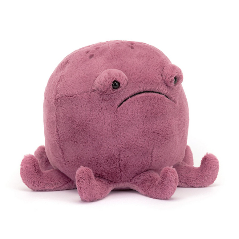 Ondre Octopus is one grumpy guy, but maybe you can cheer him up! This wriggly friend has a huge round head in cosy aubergine fur, with embroidered speckles and tiny curved arms. With bobbly sleepy eyes and a big stitched frown, Ondre is more cuddlesome than he appears!