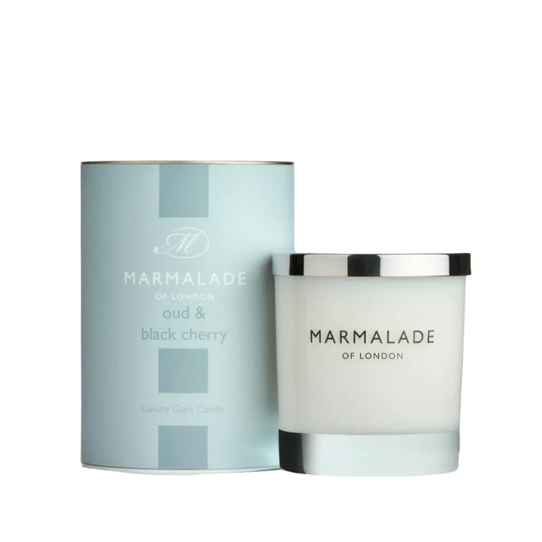 Indulge in luxury with our Oud & Black Cherry Glass Candle. The top notes of rich dark cherry and oud create an opulent scent, while white jasmine and osmanthus add a floral touch. The warm base of sweet amber, sandalwood, and tonka will fill your space with a decadent aroma, and the 230g size offers 50 hours of burn time.