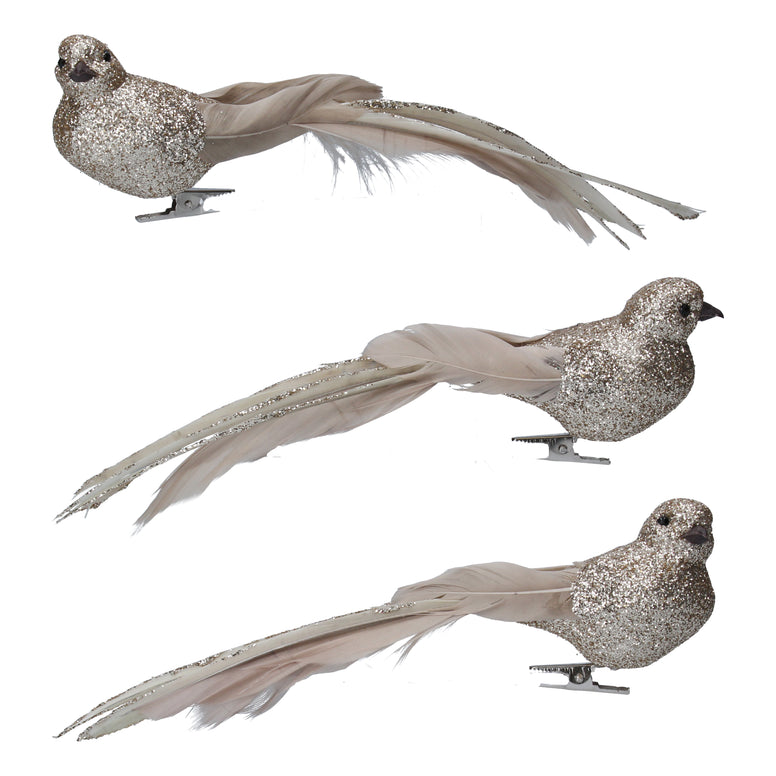 Bring a touch of festive sparkle to your tree with this charming bird clip. Crafted with shimmering pale gold glitter and delicate feather details, it's the perfect perch for your seasonal décor. Each clip features a secure grip to keep your feathered friend nestled safely among the branches. A delightful way to add movement and shimmer to any display—whether hanging on a Christmas tree, wreath, or gift package. Set of three means you can scatter these beauties throughout your home for maximum festive flair.