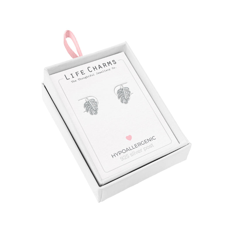 Elevate your style with our exquisite Palm Leaf Silver Stud Earrings. Designed with a stunning CZ stone, these hypoallergenic earrings provide both beauty and comfort. Measuring at 12 mm in height, they are the perfect addition to any outfit. Presented in a luxurious hanging box, these earrings are a must-have for any fashionista.