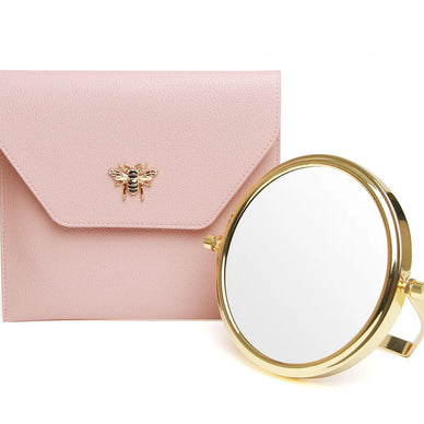 Elevate your travel beauty routine with the new Luxury Travel Mirror and Textured Vegan Leather Pouch in Pink. This chic gold mirror features 1x and 7x magnification, perfect for flawless makeup application and hairstyling. Compact and stylish, it slips into the adorned pouch with Alice Wheeler's iconic Honeybee Logo.