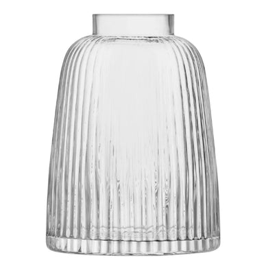 A mouth-blown glass vase with a narrow neck, curved shoulders and flared base. The tactile, pleated finish is inspired by the gathering of pleated fabric.