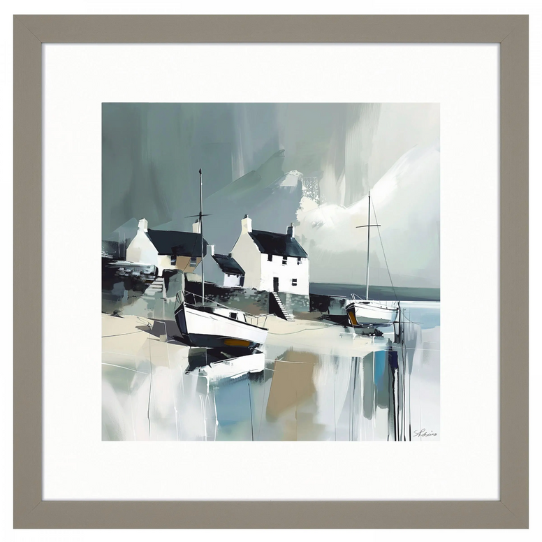 Set against an atmospheric backdrop, Sabrina Roscino's illustration of an isolated coastal village captures a remote sensation through colour and stroke technique. With its contemporary appeal, the modern composition creates a unique collaboration between the ambience and the climate that cuts through the beauty found in solitude. The abstract wall art is glazed with a taupe-textured frame that holds a minimalistic style.