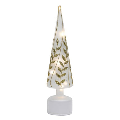 Bring a touch of sparkle and movement to your festive décor with this elegant lit rotating tree. Finished in white with golden laurel leaf detailing, it creates a warm glow when illuminated and slowly rotates to catch the light beautifully. A striking decoration for mantels, sideboards, or Christmas table displays.