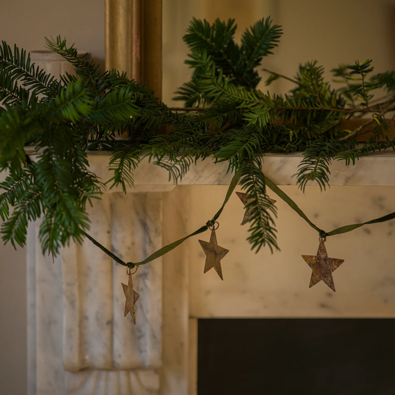 Add a touch of timeless sparkle to your festive décor with this antique brass–finished star garland, strung along a deep green velvet ribbon. The softly aged metal brings warmth and texture to seasonal displays, catching the light beautifully alongside foliage, candles or mantel styling.