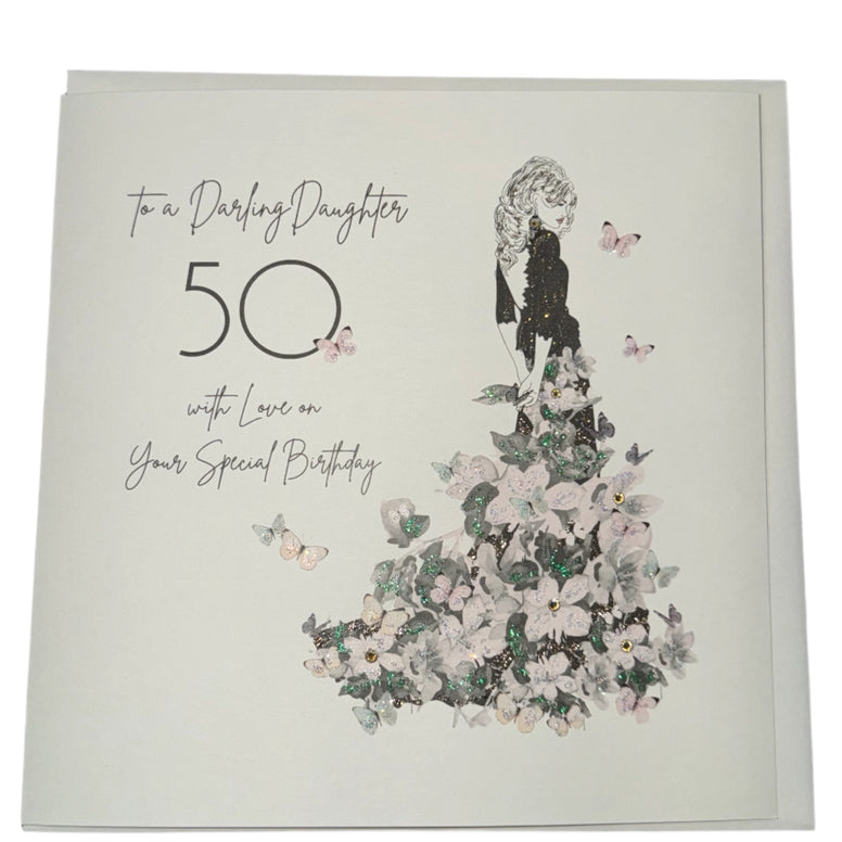 A design of pure magic! Subtle watercolour board is the canvas for this large, individually hand painted Daughter 50th Birthday card. These are out and out keepsakes, where nostalgia meets enchantment. Each design is supplied with a complementing envelope.