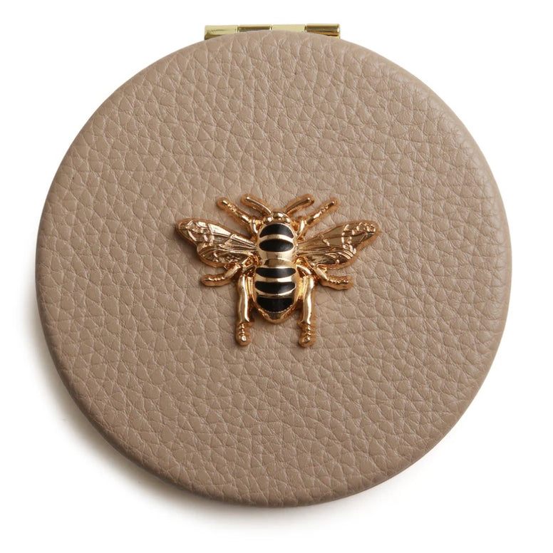 Discover the perfect blend of style and function with this exquisite compact mirror by Alice Wheeler London. Crafted with twin gold-toned metal frames and finished in luxurious vegan leather, this mirror features both standard and 1x magnification. Adorned with Alice's iconic honey bee, it arrives in a beautifully textured gift box with a custom-molded insert, ensuring safe travel and elegant presentation. Its compact 7cm diameter makes it ideal for handbags and Alice Wheeler accessories