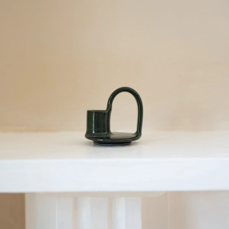 A charming stoneware candle holder finished in a rich forest-green glaze, complete with a classic handle for that timeless, old-world feel. It’s a beautifully cosy addition to any room — perfect for adding a warm glow to evenings at home.