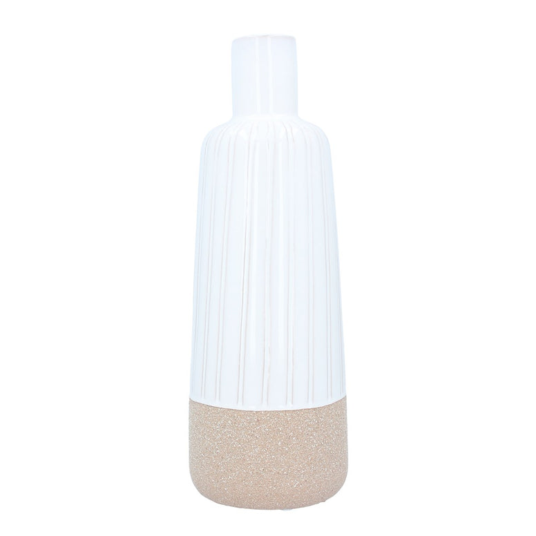 Make a statement with this large, white demi-glazed ceramic bottle. Rustic, vertical scores in the glaze lead the eye down to the unglazed section which creates texture and adds to the sandy, coastal impression.